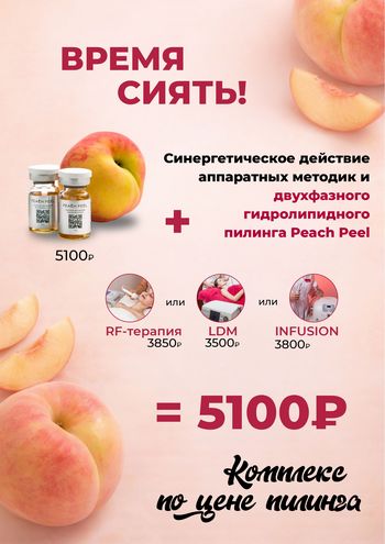 В рамках акции мы объединили синергетическое действие двухфазного гидролипидного пилинга Peach Peel и передовых аппаратных методик.